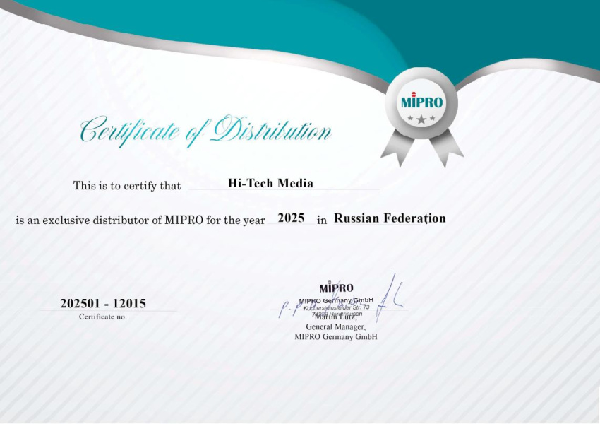 Эксклюзивный дистрибьютор MIPRO, Сертификат 2025 год