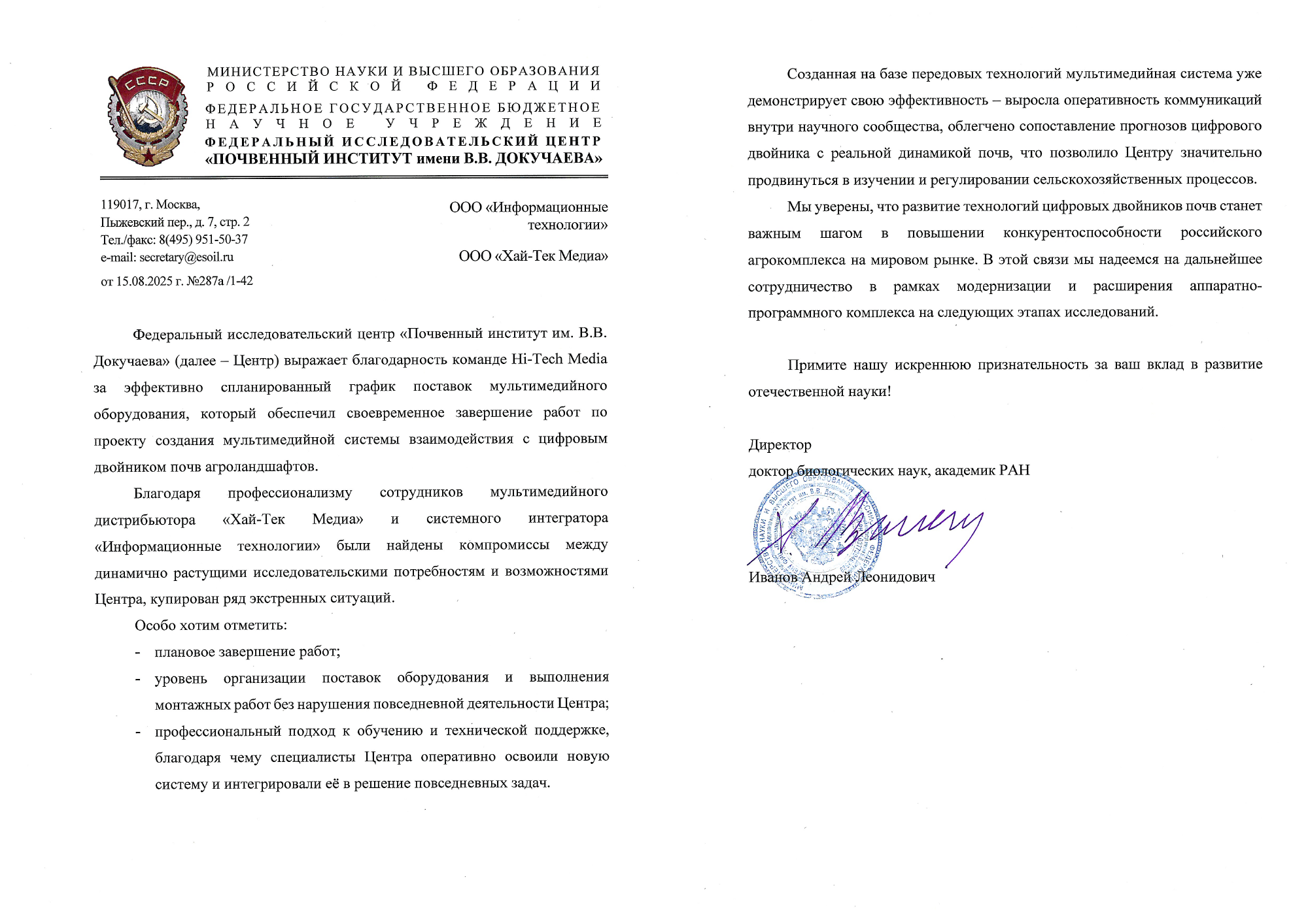 Федеральный исследовательский центр «Почвенный институт им. В.В. Докучаева» (далее ─ Центр) выражает благодарность команде Hi-Tech Media за эффективно спланированный график поставок мультимедийного оборудования, который обеспечил своевременное завершение работ по проекту создания мультимедийной системы взаимодействия с цифровым двойником почв агроландшафтов.