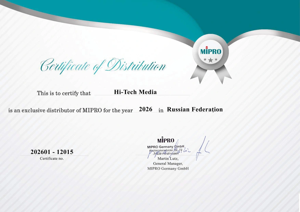 MIPRO — Компания MIPRO Electronics Co., Ltd основана в 1995 г., а в 2000 г. запатентовала технологию АСТ (автосканирования свободных частот и синхронизация приёмника с передатчиком). Основной продукцией MIPRO являются качественные и надёжные профессиональные аналоговые и цифровые радиомикрофонные системы, беспроводные системы персонального ушного мониторинга, качественные и надёжные микрофонные капсюли, петличные, головные и инструментальные микрофоны, а также выносные антенны и системы усиления и стабилизации радиочастотного сигнала.