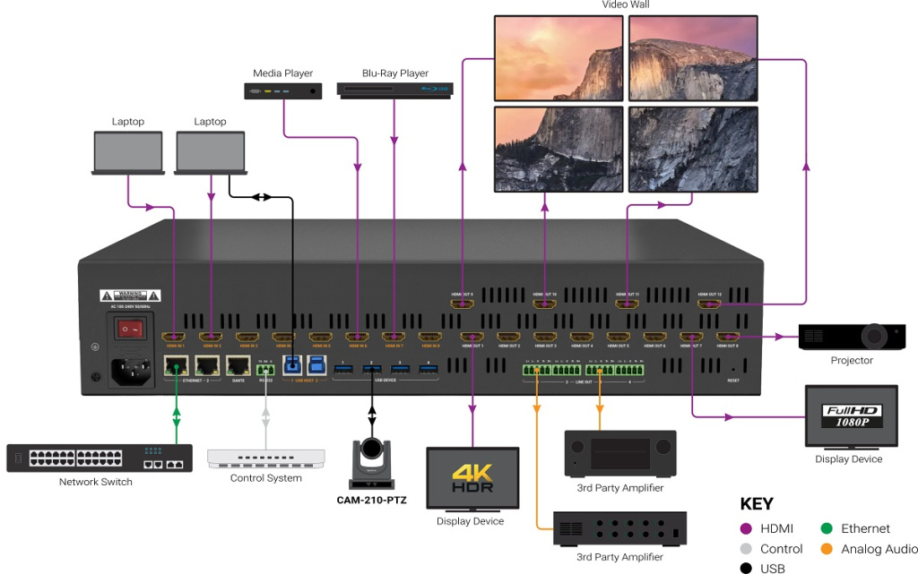 - Предлагает значительный уровень подключений с 8 входами HDMI и 12 выходами HDMI, все из которых способны обрабатывать видео 4K60