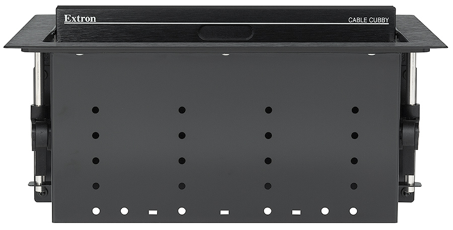 Конструкция Cable Cubby 1402 имеет ряд уникальных, удобных для интегратора особенностей, разработанных Extron для оперативной сборки и инсталляции. Встроенная система фиксаторов быстро закрепляет лючок на поверхности мебели без использования инструментов. Просто поместите лючок в проём, подтяните фиксатор к поверхности, а затем, поверните крепёжный механизм, чтобы закрепить лючок на месте. Амортизатор крышки обеспечивает мягкое, бесшумное использование для гармоничной работы в конференц-залах и залах заседаний класса «High-end». Уменьшенная высота располагаемого под столом лючка идеально подходит для гибких модульных проектов с раскладными столами. В комплект Cable Cubby 1402 входят стандартные опоры для подключений для установки трёх модулей Retractor, трёх панелей AAP или восьми AV-кабелей с каждой стороны. Опоры для AV-подключений можно разместить слева или справа от выбранного блока питания AC. Для обеспечения гибкости при проектировании доступные в качестве опции комплект опор для кабелей и комплект опор для Retractor также позволяют устанавливать AV-кабели или модули Retractor слева и справа от выбранного блока питания. Опоры продаются парами; каждая опора поддерживает четыре AV-кабеля или два модуля Retractor.
