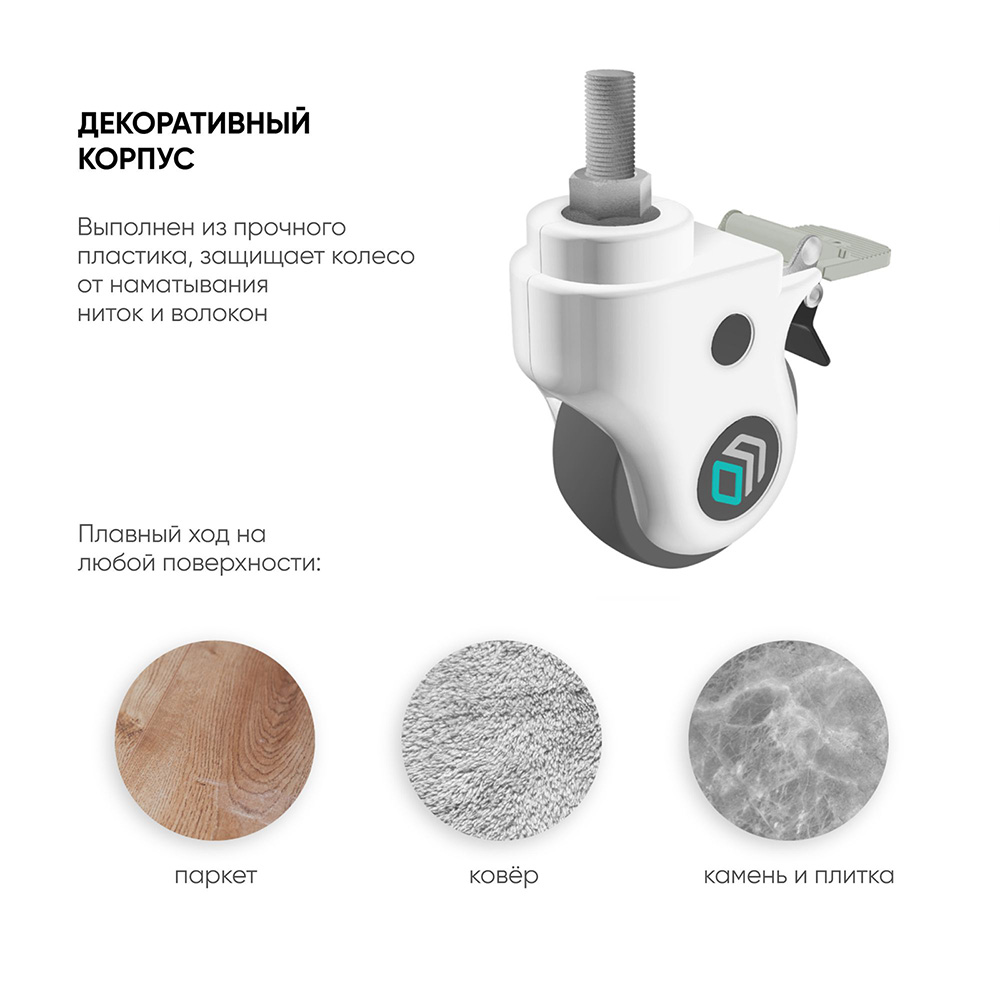 Крутящаяся часть колеса изготовлена из полуэластичной резины, устойчивой к истиранию. Материал корпуса – прочный пластик. Это позволяет использовать колеса на поверхностях с неровностями и мягких покрытиях.