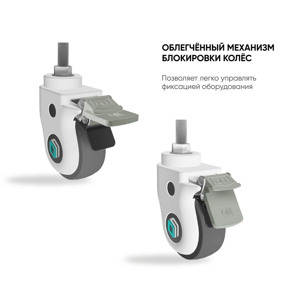 Педаль имеет два положения – ON и OFF, что позволяет легко и быстро одним движением закрепить оборудование на нужном месте или, наоборот, передвинуть его.