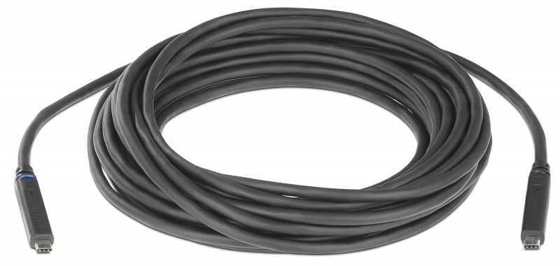 - Внешнее питание не требуется — встроенная активная схема получает питание от устройства, подключённого к одному из концов кабеля, тем самым позволяя сэкономить на отдельном внешнем блоке питания.