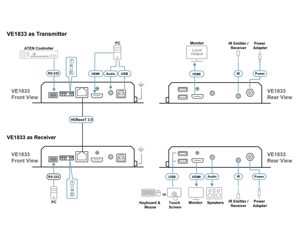 Приёмопередатчик ATEN VE1833 с поддержкой передачи True 4K HDMI и USB, основан на базе технологии HDBaseT 3.0 Lite с поддержкой питания PoH. Он обеспечивает возможность простой настройки через DIP переключатели в режим приёмника или передатчика. Благодаря технологии HDBaseT 3.0 можно передавать без задержек несжатый сигнал True 4K HDMI (4К@60Гц 4:4:4) на расстояние до 40м по одному кабелю витой пары Cat6a (при использовании кабеля Aten HDBaseT 3 Certified Cat 6a U/FTP).