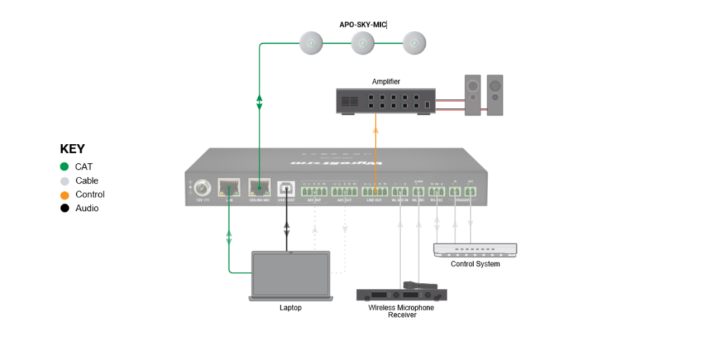 WyreStorm APO-SKY-MIC применяется как дополнительный потолочный микрофон для видеобара APO-VX20-UC или как независимый микрофон совместно с предусилителем COM-MIC-HUB.
