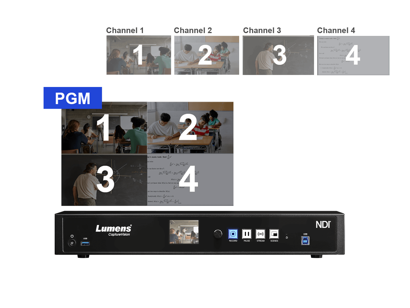 LC300 записывает программное видео и четыре исходных входных видео с независимыми аудио источниками. Это упрощает создание архивов и видеопроизводство.