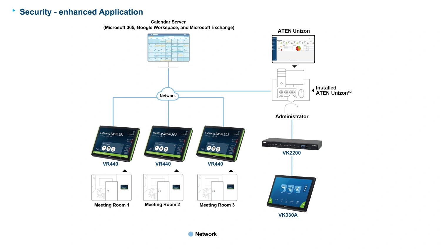 Благодаря интеграции с ATEN Unizon и системой бронирования RBS, начало или завершение встречи, просмотр состояния комнаты и продление бронирования — все это выполняется всего несколькими нажатиями на панели — в любой момент во время встречи.