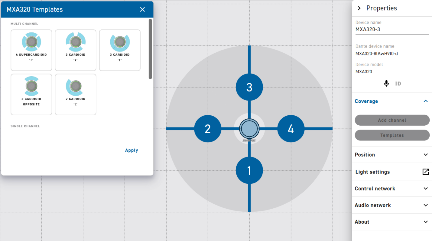 - Параметры захвата звука можно настраивать визуально в программном обеспечении Shure Designer, что позволяет удобно отображать зону покрытия MXA320 вместе с другими продуктами экосистемы Microflex в одном помещении
