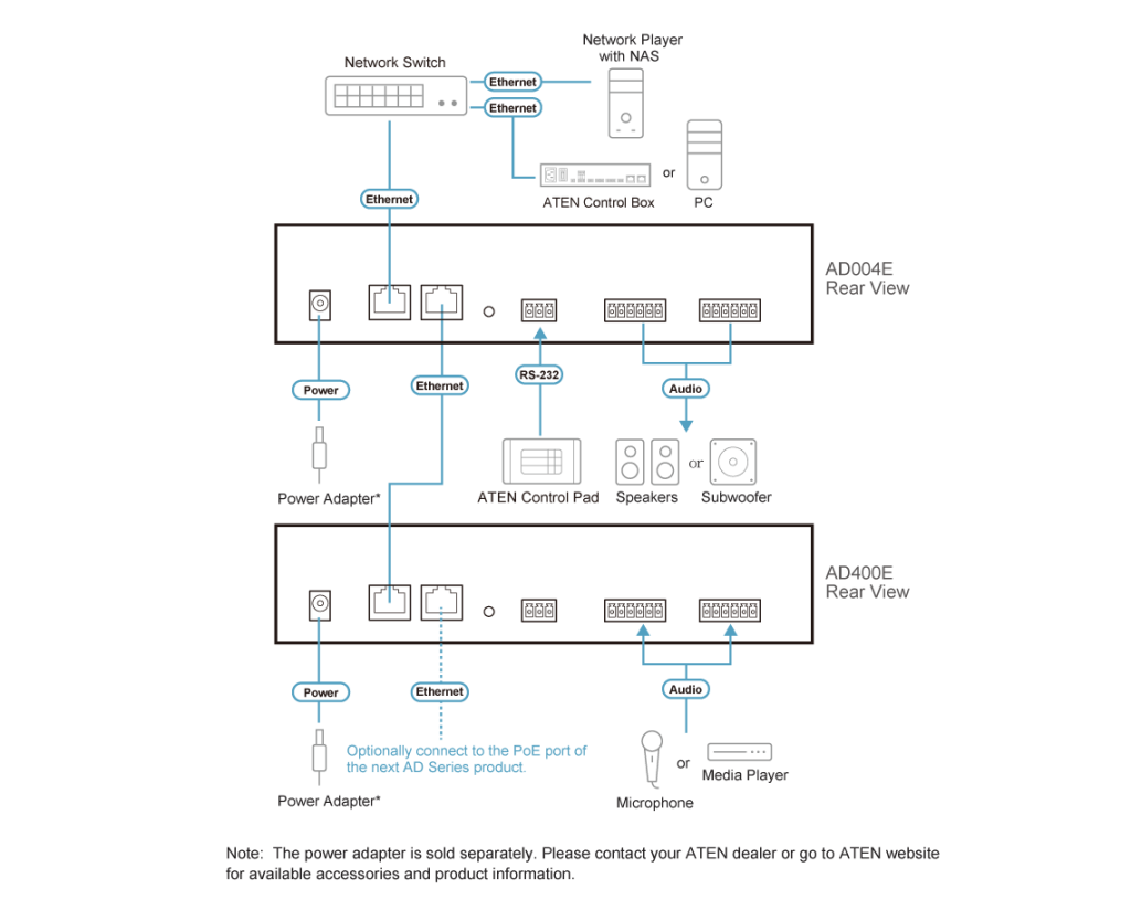 AD400E не только улучшает взаимодействие между устройствами для AoIP (распространение цифрового звука по IP-сети) и выполняет эффективное предусиление. При совместном использовании с продуктами серии профессионального звука компании ATEN, он также реализует распределенную архитектуру DSP, повышая гибкость установки, снижая общую стоимость и расширяя области применения. Он подходит для профессиональных сфер, использующих сетевую технологию Dante, например, конференц-залов различного размера, или мест приема гостей, таких как рестораны и бары.
