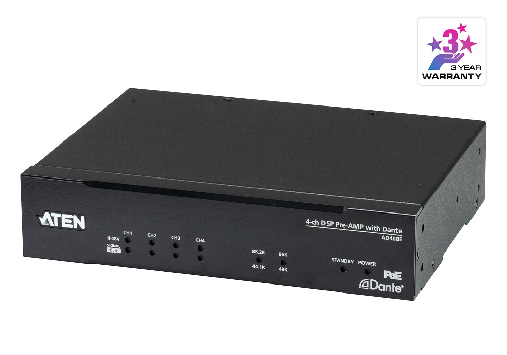 Предусилитель модели Aten AD400E преобразует звуковые сигналы, поступающие от 4 входных балансных / несбалансированных микрофонных / линейных каналов в пакеты технологии Dante для работы с Dante-совместимым оборудованием. При этом он также совместим со стандартом AES67, что повышает возможность взаимодействия между различными сетевыми протоколами и звуковыми устройствами. Поддержка 24 битного звука с частотами дискретизации 44,1 кГц, 48 кГц, 88,2 кГц и 96 кГц позволяет соответствовать требованиям различных применений коммерческого уровня. Электронная схема профессионального предусилителя AD400E обеспечивает широкий динамический диапазон, высокий запас сигнала и отличное соотношение сигнал/шум (SNR). На любом отдельном входе можно включить фантомное питание (+48 В) для поддержки конденсаторных микрофонов при практически отсутствующем искажении сигнала.