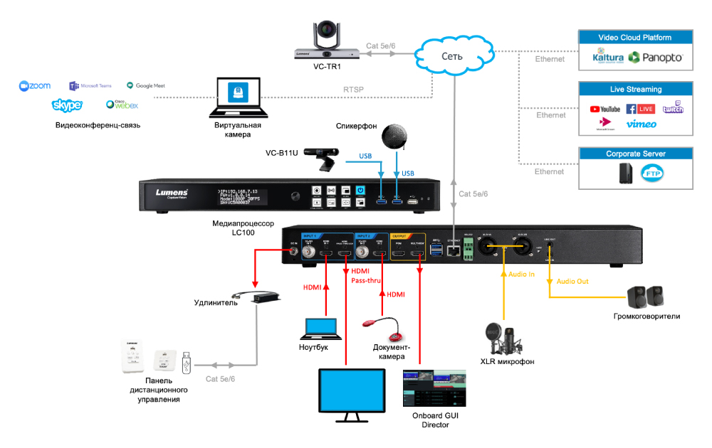 Устройство может управлять IP-камерами Lumens и запускать предустановки, а также позволяет пользователям переключаться между входами в режиме реального времени, микшировать источники и добавлять заголовки и наложения.