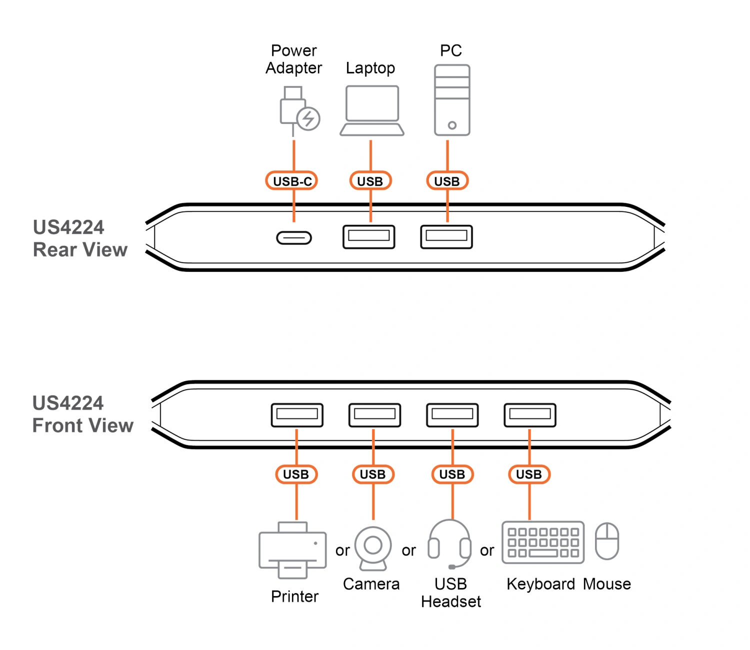 Коммутатор ATEN US4224 одним нажатием кнопки позволяет совместно использовать 4 периферийных USB-устройства между двумя компьютерными системами со скоростью 480 Мбит/с.
