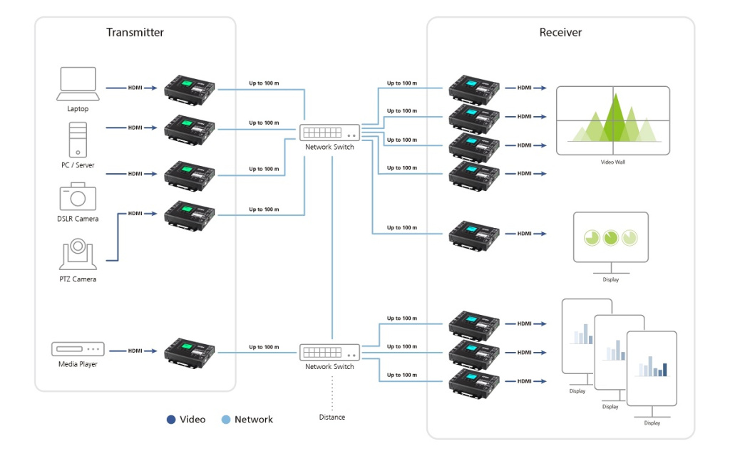 Настраиваемый режим работы в качестве передатчика или приёмника повышает гибкость технологии AV-over-IP, позволяя легко создавать любые конфигурации, от простых систем точка-точка, до решений с сотнями оконечных устройств.