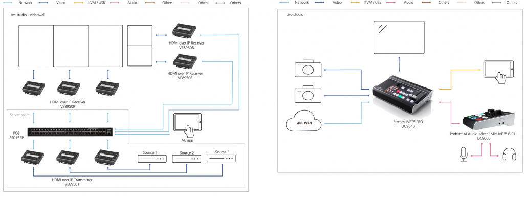 Живая студия – создание контента профессионального уровня благодаря компактному универсальному видеорешению ATEN. Выставки, торговые презентации, конференции, тренинги можно транслировать в прямом эфире на любую видеоплатформу с качеством Full HD. Кроме того, системой легко управлять через приложение OnAir™ на iPad или планшете Android.