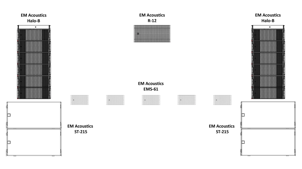 - 12 × EM Acoustics HALO-B (формат L/R, в подвесе или наземная установка) + чехлы